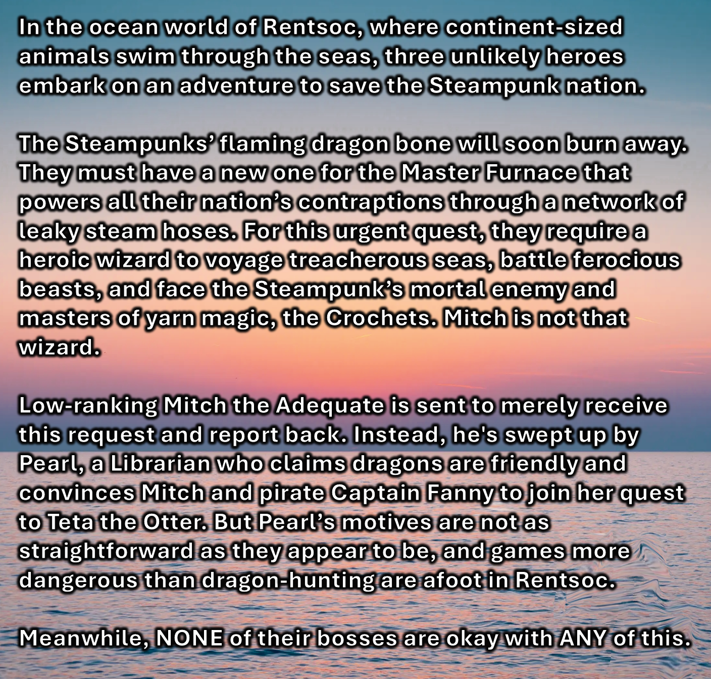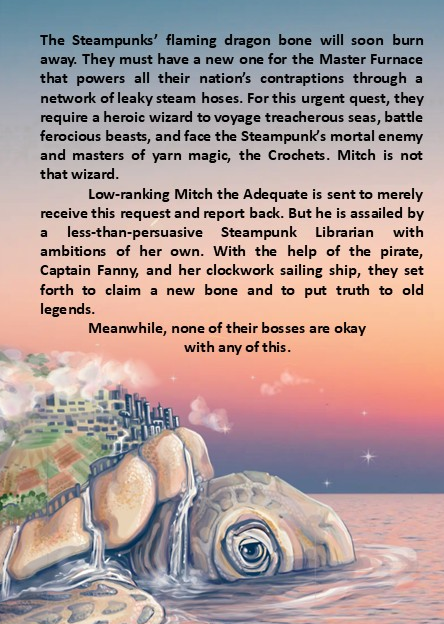 In the ocean world of Rentsoc, where continent-sized animals swim through the seas, three unlikely heroes embark on an adventure to save the steampunk city of Shellsteam. One can’t have steampunk without steam, so when the magical dragon bone powering Shellsteam's Master Furnace begins running out, timorous wizard scribe Mitch the Adequate is sent to deliver the message to his superiors. Instead, he's swept up by Pearl, a Librarian who claims dragons are friendly and convinces Mitch and pirate Captain Fanny to join her quest to Teta the Otter. But Pearl’s motives are not as straightforward as they appear to be, and games more dangerous than dragon-hunting are afoot in Rentsoc.